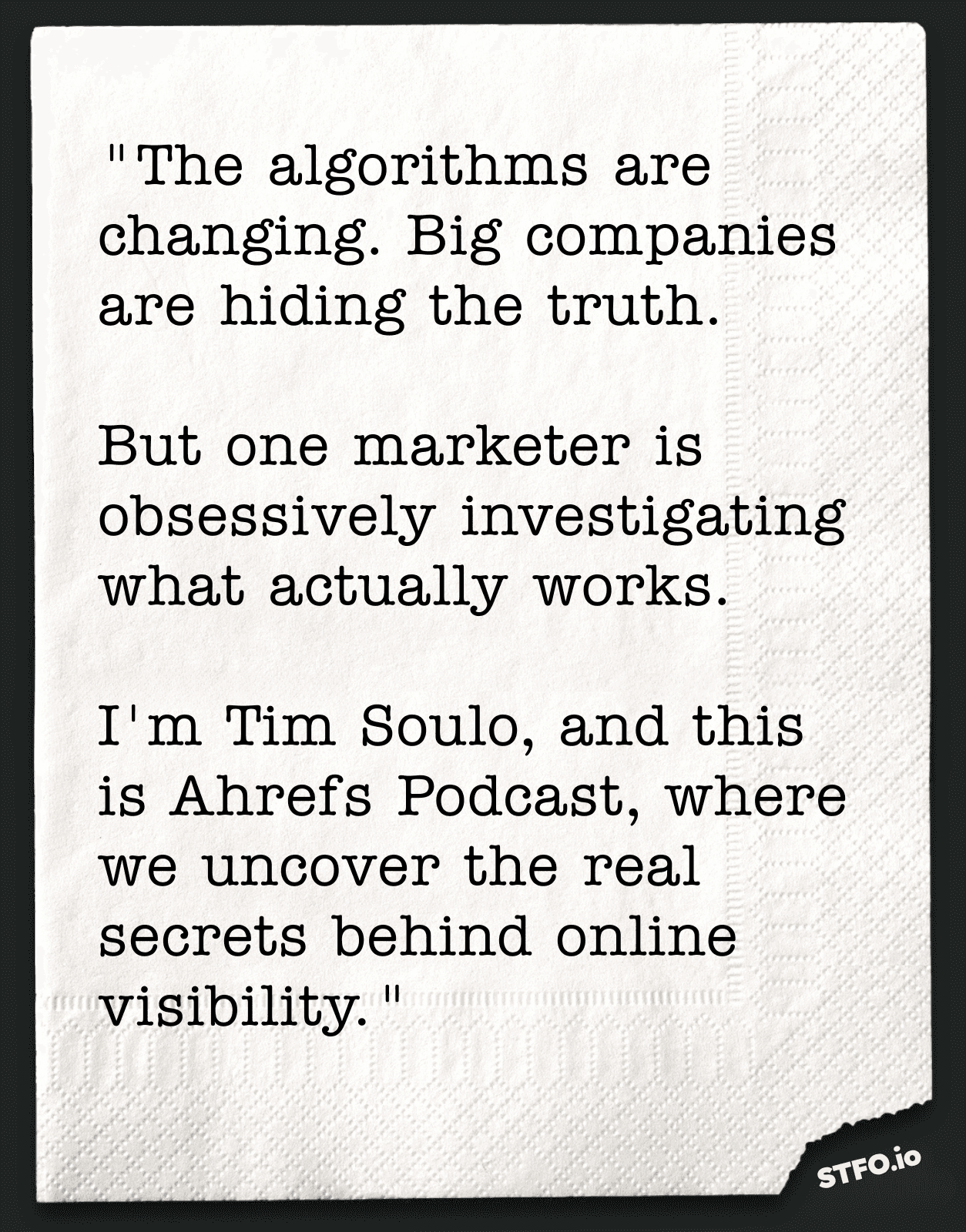 “The algorithms are changing. Big companies are hiding the truth. But one marketer is obsessively investigating what actually works. I’m Tim Soulo, and this is Ahrefs Podcast, where we uncover the real secrets behind online visibility.”