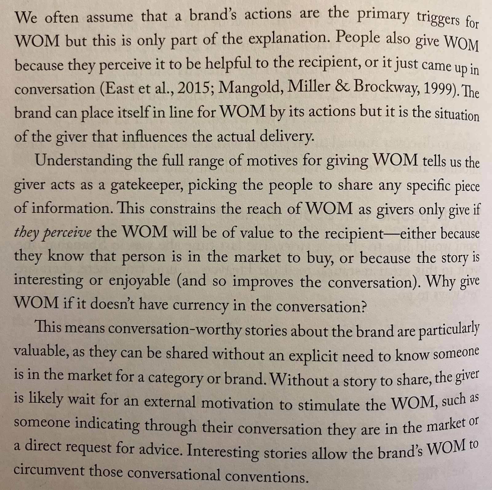 The key phrase is, in my opinion, “Conversation-worthy stories about the brand are particularly valuable, as they can be shared without an explicit need to know someone is in the market for a category or brand.”